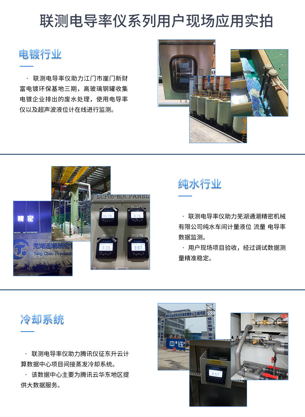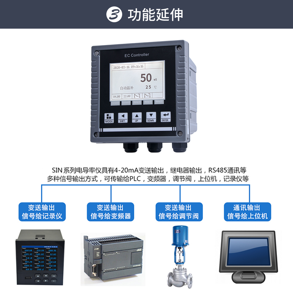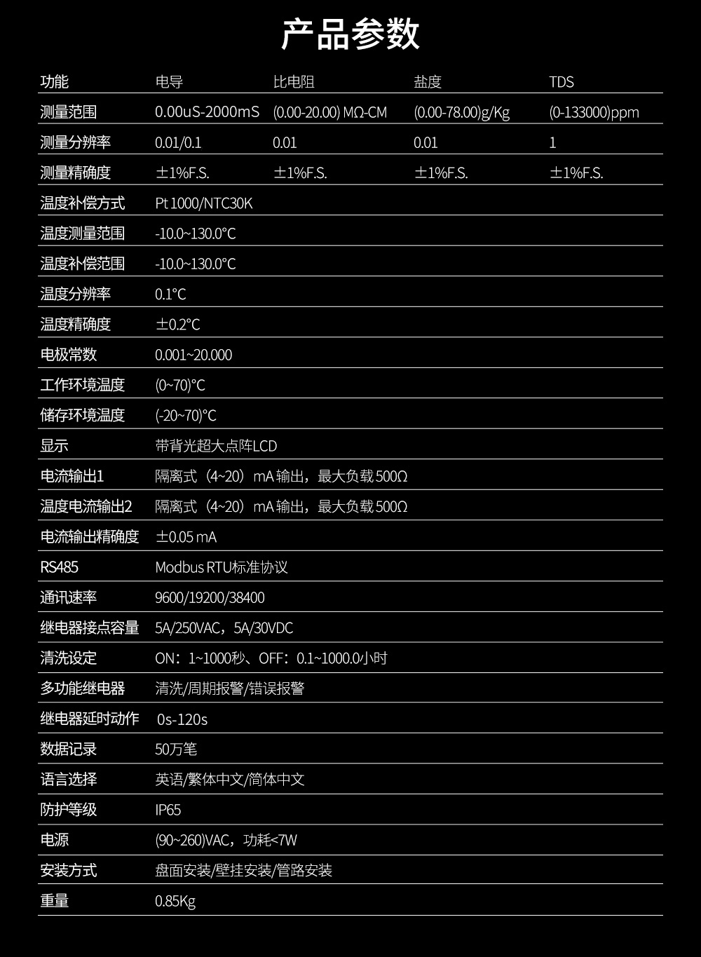儀器用于工業(yè)上電導(dǎo)/比電阻/鹽度/溶解固體總量及溫度的測量,如: 廢水,純凈水,環(huán)境監(jiān)測,食品生產(chǎn)過程等,儀器可以盤面安 裝,壁掛安裝,管路安裝。儀器提供 2 路電流輸出,最大負載為 500Ω, 儀器提供 3 路控制用繼電器,繼電器最大承受電壓及電流為 5A/250VAC 或 5A/30VDC。