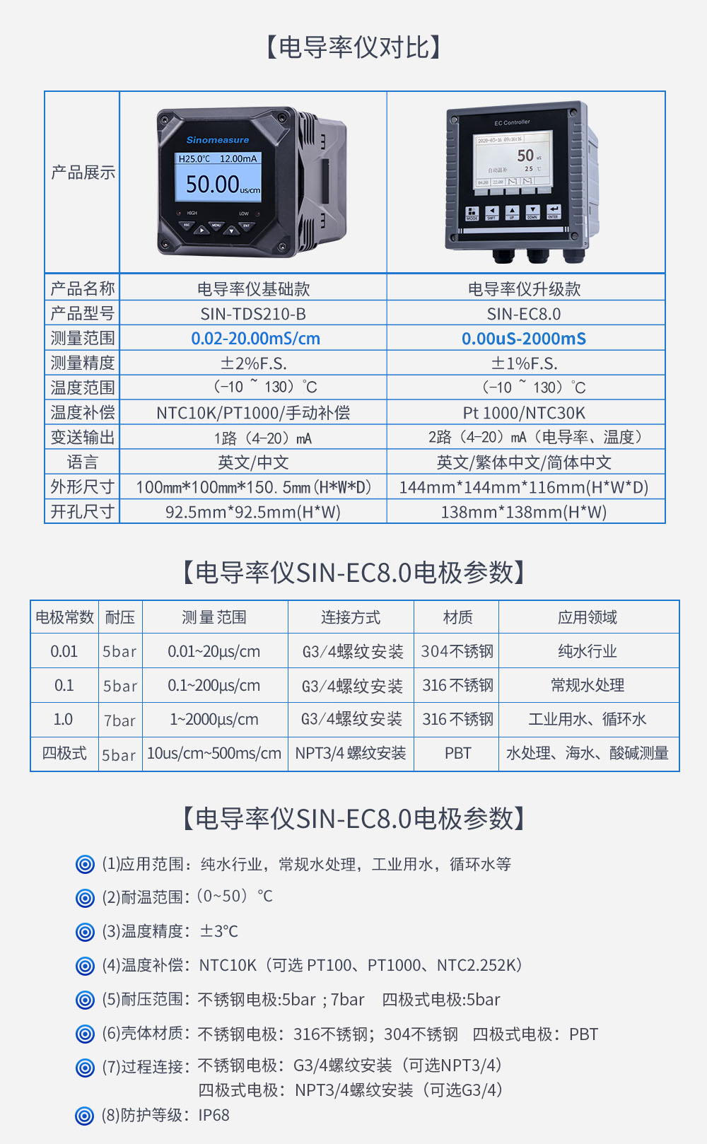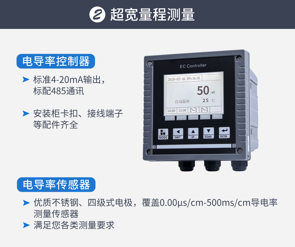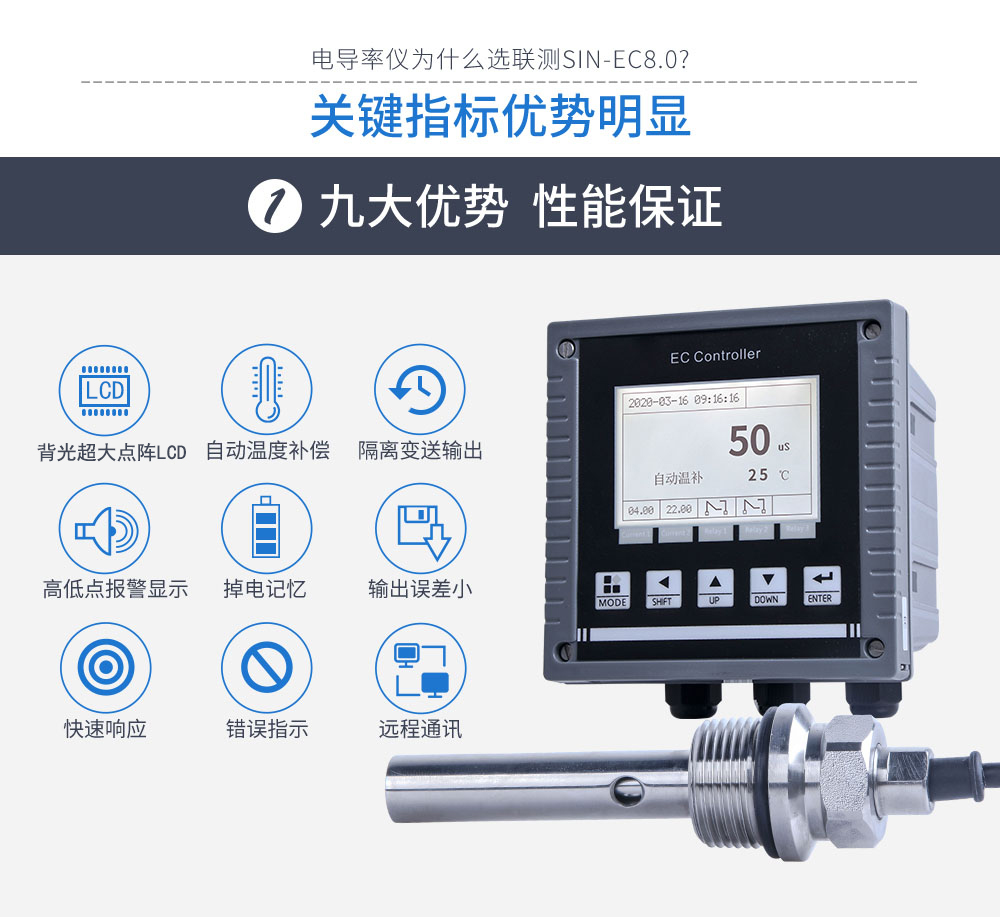 儀器用于工業(yè)上電導(dǎo)/比電阻/鹽度/溶解固體總量及溫度的測量,如: 廢水,純凈水,環(huán)境監(jiān)測,食品生產(chǎn)過程等,儀器可以盤面安 裝,壁掛安裝,管路安裝。儀器提供 2 路電流輸出,最大負載為 500Ω, 儀器提供 3 路控制用繼電器,繼電器最大承受電壓及電流為 5A/250VAC 或 5A/30VDC。