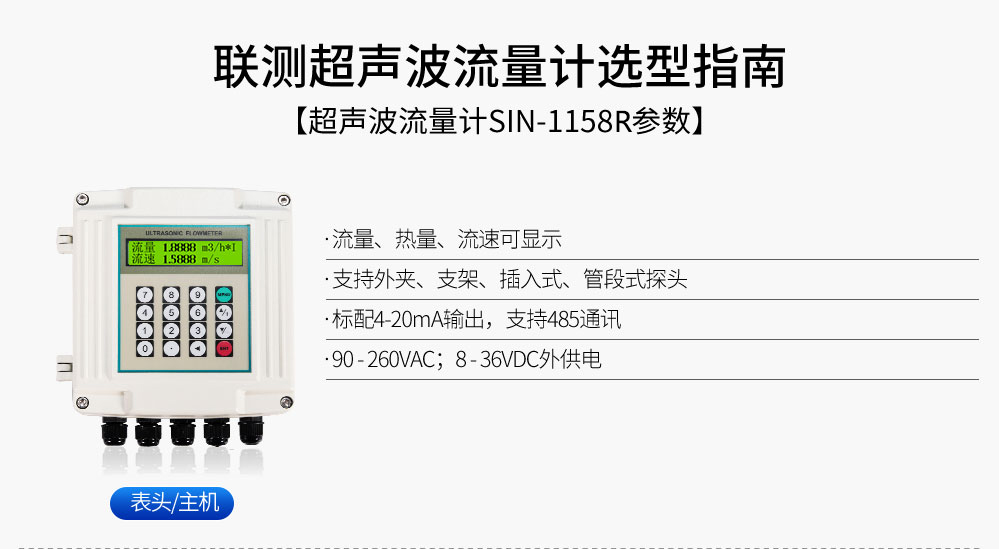 聯測儀表SIN-1158R外夾壁掛式超聲波流量計主要是對熱交換系統中載能介質(液體水)的供水溫度、回水溫度及瞬時流量進行實時測量,并按照熱力學能量計算公式,對系統消耗的冷量或熱量值進行計算并保存的裝置,聯測超聲波(冷)熱量表適用于空調回水、樓宇能源管理以及供暖等行業,超聲波原理讓其安裝更為方便。