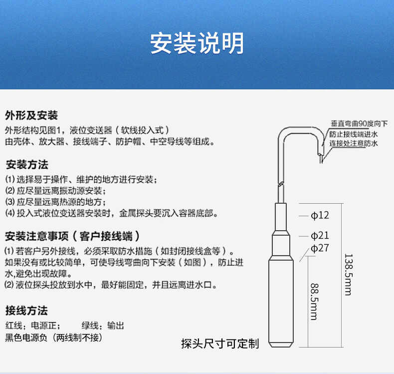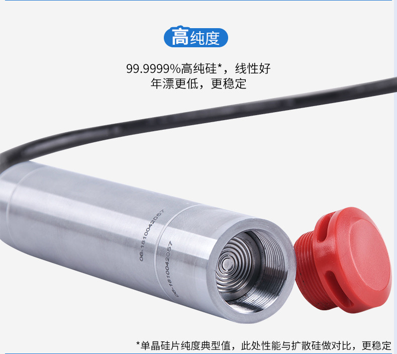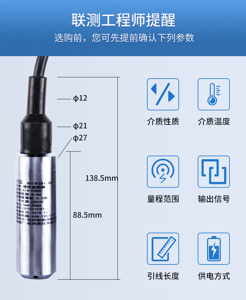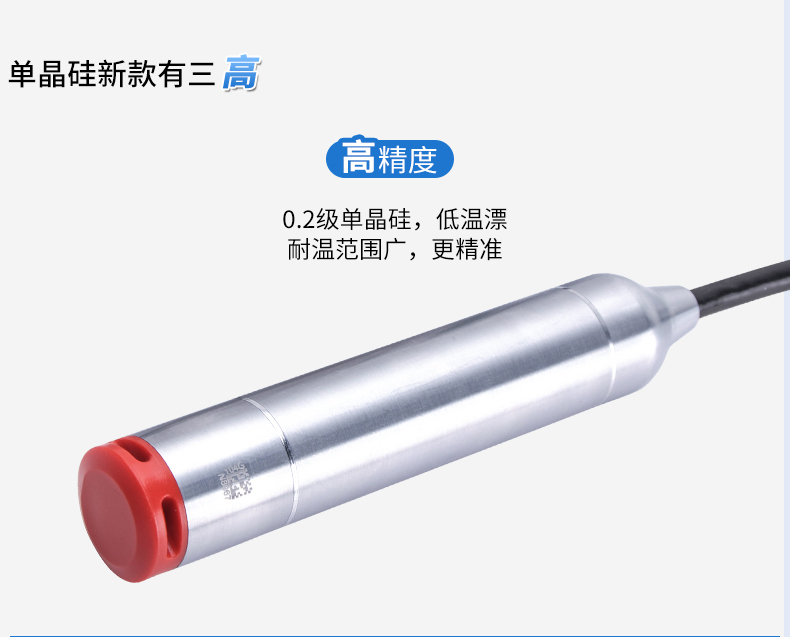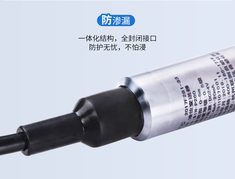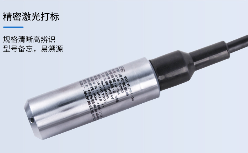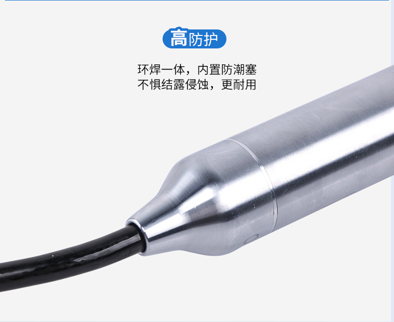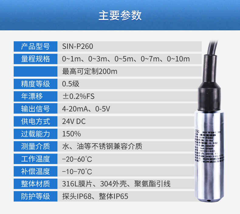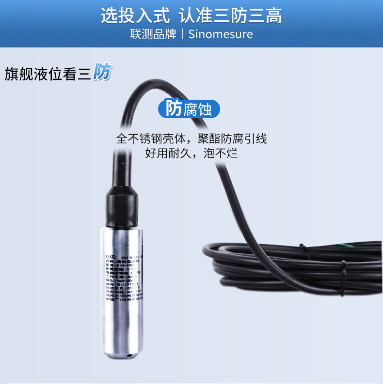 聯測SIN-P260投入式液位變送器由高性能擴散硅壓阻式壓力傳感器作為測量元件,把與液位深度成正比的液體靜壓力準確測量出來,并經過信號調理電路轉換成標準(電流或電壓)信號輸出,建立起輸出信號與液體深度的線性對應關系,實現對液體深度的測量。